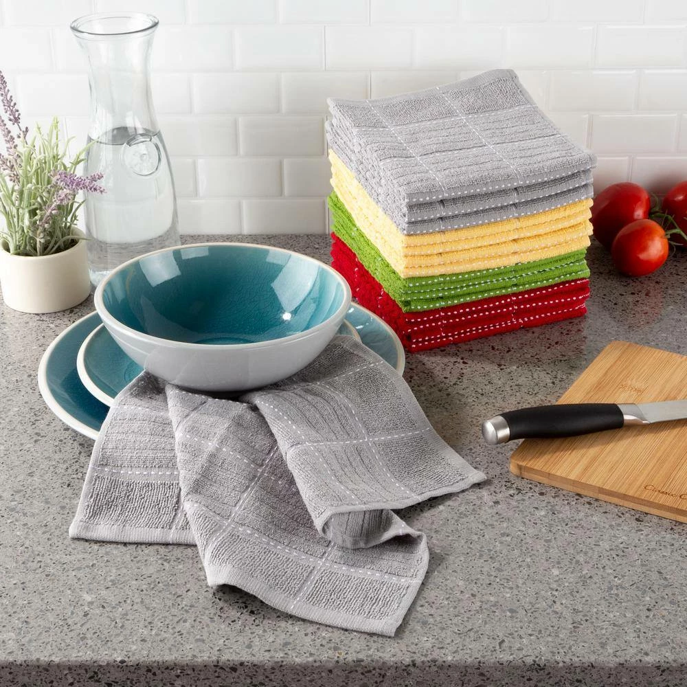 Tackle all your drying, wiping and cleaning tasks with the ultra-absorbent 16-Piece Kitchen Dish Cloth Set by Weymouth Home. Made of 100% cotton with a tightly woven checked pattern, these washcloths are practical for everyday use while offering a stylish look that will make an impression with your guests or as a housewarming gift. The set includes 4 green, 4 gray, 4 red and 4 yellow solid colored towels with a modern design that is sure to complement your kitchen decor.