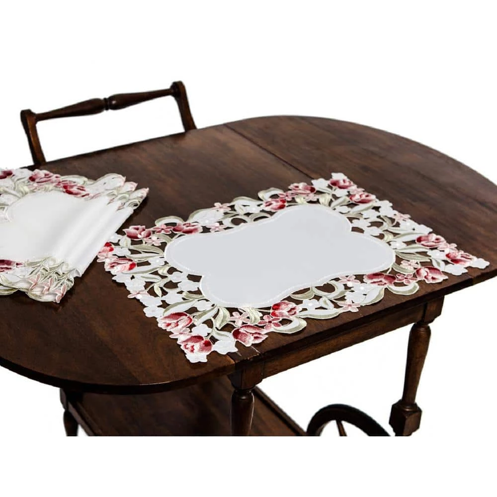 Lushly embroidered roses on rich cutwork elegantly trim this lovely table runner and placemat collection. Sure to start a conversation or two at your next gathering. As your definitive home decor destination, Xia Home Fashions feels that every day should be lived fashionably. Our distinctive designs, rich details and tempting accessories are sure to endlessly fulfill your home’s finicky fashion sense. Whether you are keeping up with the ever changing colors of the holidays and seasons, looking for a stunning piece to tie your existing interior decor together while staying in tune with your individual style or simply in need of an easy care focal point for an upcoming party or event, Xia Home Fashions has stylish creations that will complete your look and win complements at your next gathering.