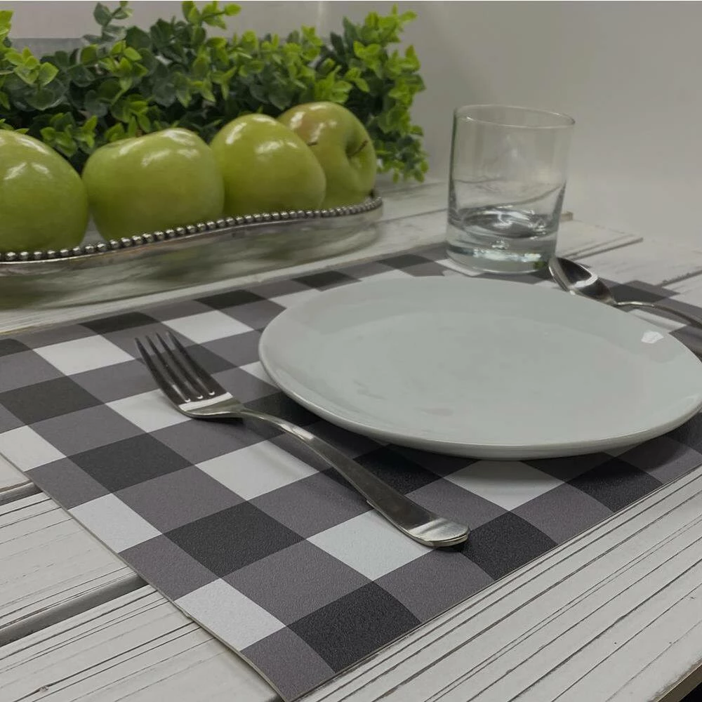 Whether you need indoor placemats for your kitchen or dining room, or outdoor placemats for the patio table, andie home placemats will work for you. A set of 6 placemats, they not only look great but also protect your table from food, water, and heat damage. All andie home placemats are crafted with pride in the USA, are leak-proof, stain-resistant, and prevent crumbs and other food particles from getting stuck in the placemat surface or on your table. Easy to maintain and store. Simply wipe clean with water and mild dish soap. BUFF CHECK – from the Ilene Rubin Designer Series, features the look of a fabric woven gingham in easy care vinyl, which can be used both outdoors and in any indoor setting.