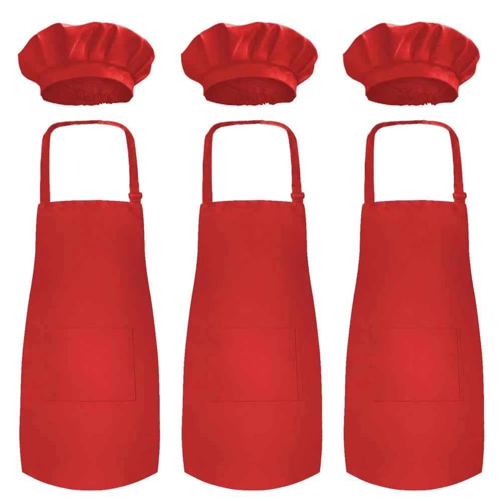 - WHAT YOU GET – Package contains 3 sets of products, Each set includes 1 apron and 1 chef hat. A Lovely apron(18″ x 23-1/2″) with an adjustable strap of 24″ for age 6-12 years and one large pocket. And a chef hat(10″ Diameter) with elastic band in the back.
