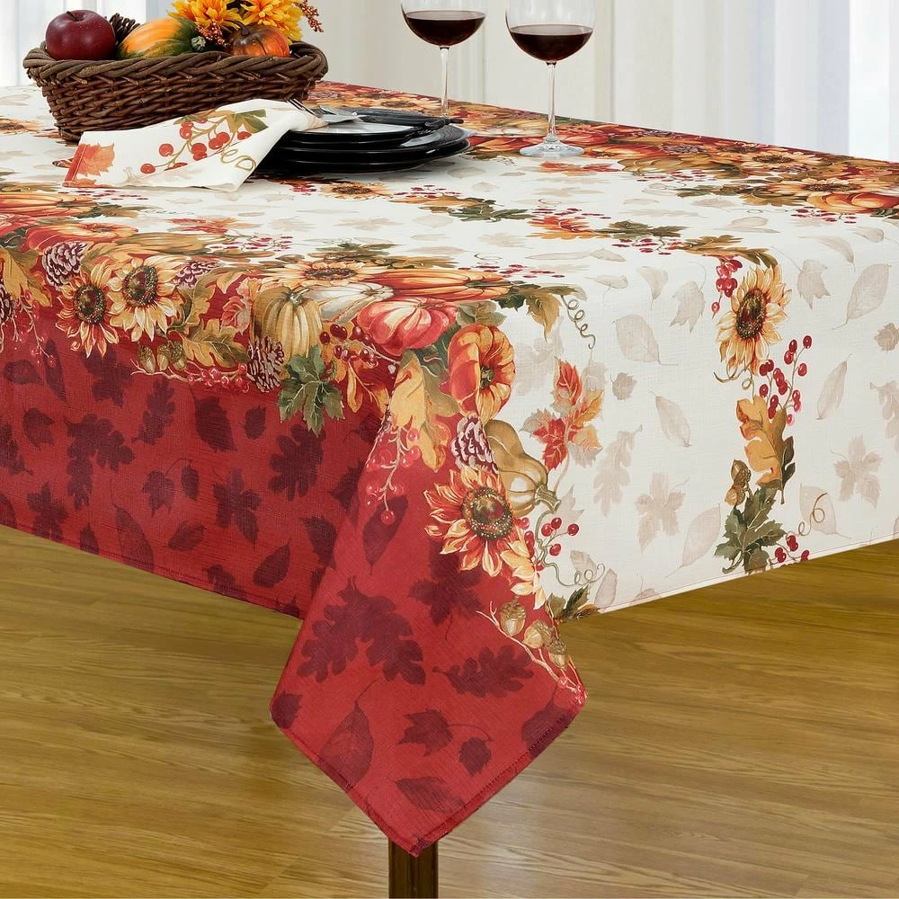 The Swaying Leaves Double Border tablecloth is the perfect solution to your seasonal decorating needs. Double border harvest design features gourds, pumpkins, sunflowers and leaves in red, orange, yellow and cream. Excellent for special occasions, events, parties, family gatherings and everyday use during fall. Soft and durable fabric can be ironed to release stubborn creases and make your tablecloth wrinkle free. Hemmed edge adds a finished look and prevents wear and tear. Available in a large selection of table shapes and sizes including rectangle and round to fit all your entertaining needs. 100% Polyester. Easy care, machine washable. Coordinate to Swaying Leaves bordered napkins and placemats to complete the look.