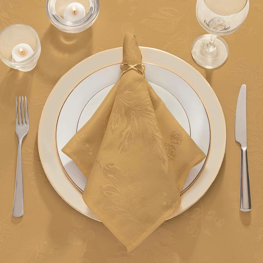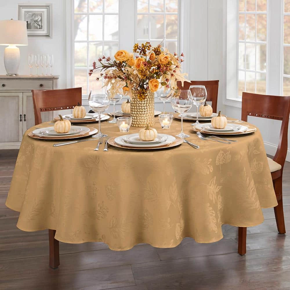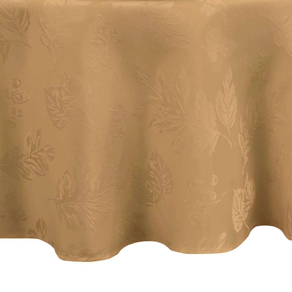 The Elegant Woven Leaves Damask tablecloth is the perfect solution to your decorating and table linen needs. Delicately woven jacquard leaf design gives it the versatility of a solid, with a touch of seasonal fashion. Excellent for special occasions, events, parties, fall gatherings and everyday use this table cloth has the soft hand of an ordinary tablecloth, with the added function you need. Fabric features water and stain repellant finish. Silky fabric can be ironed to release stubborn creases and make your tablecloth wrinkle free. Hemmed edge adds a finished look and prevents wear and tear. Available in a large selection of table shapes and sizes to fit all your entertaining needs. 100% Polyester. Easy care, machine washable.