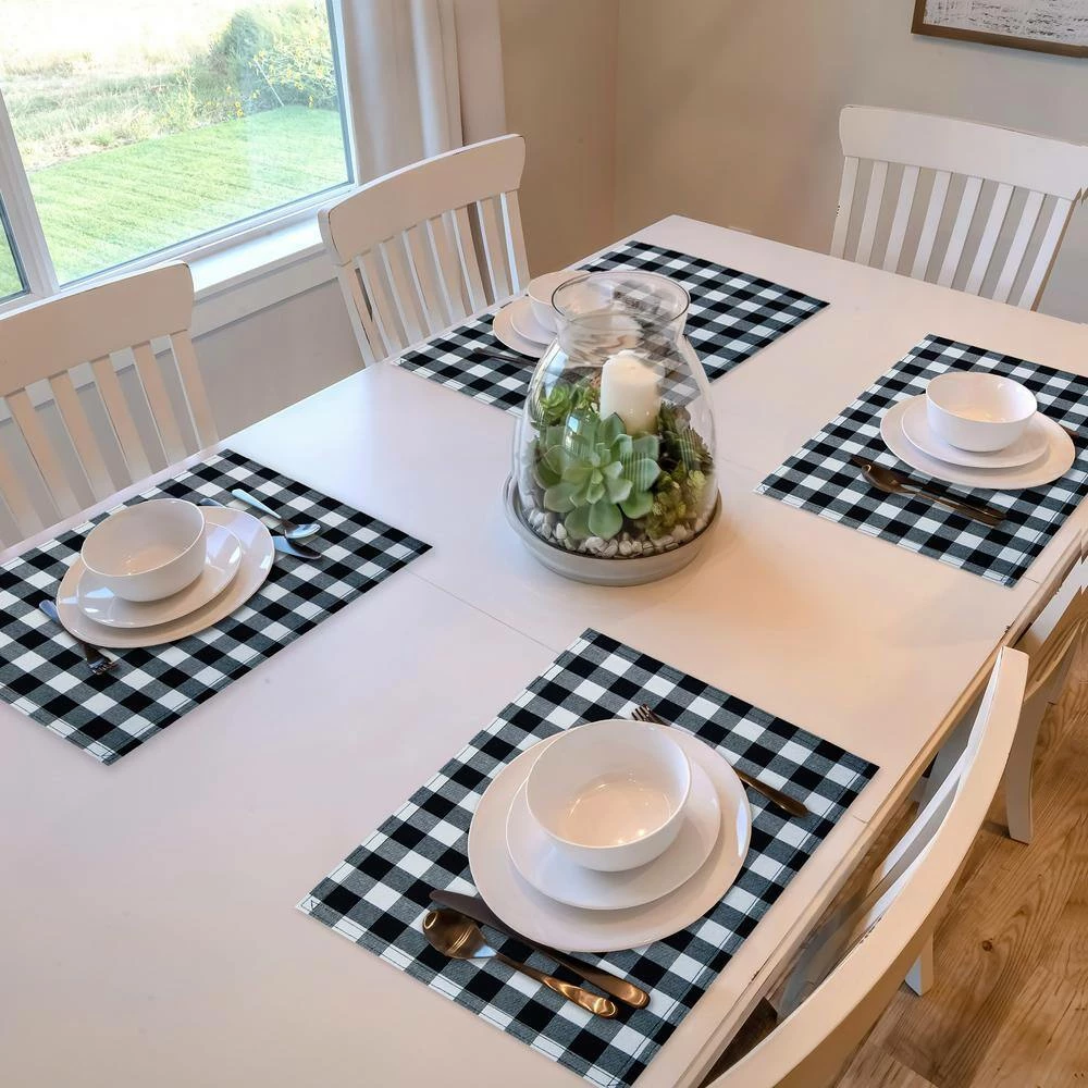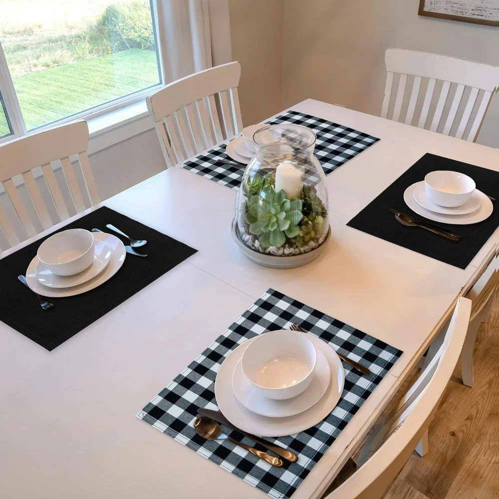 The classic buffalo check pattern comes to life on the Buffalo Check Placemats. Four 12 in. x 18 in. placemats are made of fabric that is woven, using yarn dyed and quilted poly-cotton material and are a perfect accent to any table. These placemats are reversible and can be used on the solid side or with the buffalo check design. Also a great way to mix up your dinner table by showing either the solid and or pattern sides. The Buffalo Check Place Mats are stain repellent, machine washable and sold in a pack of four. Coordinate your home in buffalo check with the entire Buffalo Check Collection of window treatments, floor mats, napkins, kitchen accessories and so much more.