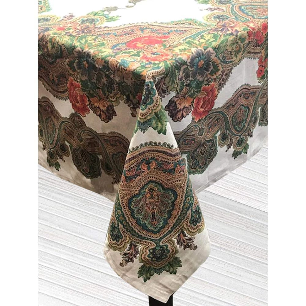 Cashmere tablecloth from the Episode collection. This fine tablecloth is made in Spain out of 75% Cotton and 25%Linen. Cashmere tablecloths boast a brightly colored design on a smooth cream background. Available sizes include: 52 in. x 70 in., 60 in. x 84 in., 60 in. x 104 in., 60 in. x 120 in. and 70 in. Rnd.