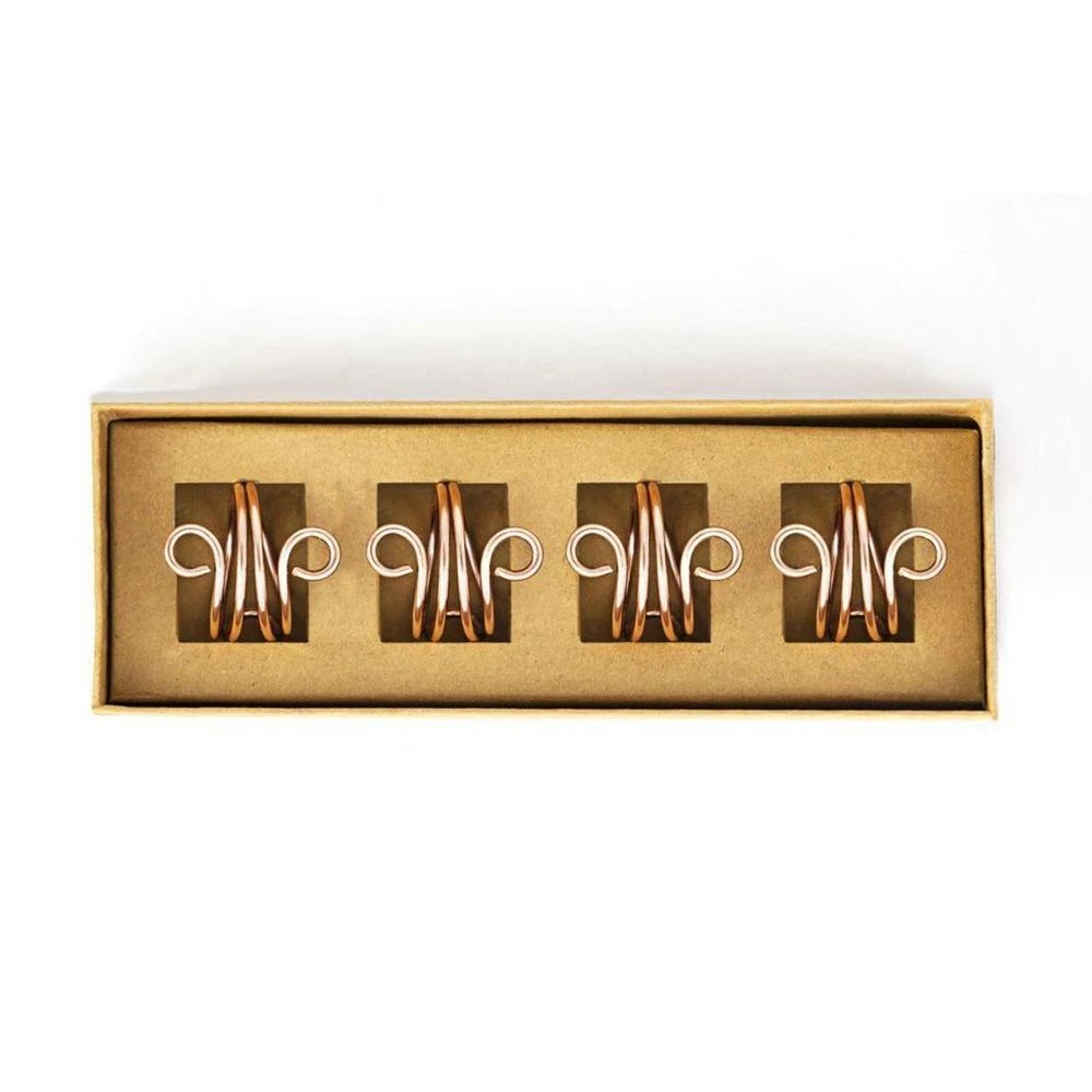 These beautiful copper wire napkin holders come in a set of 4. They are standard sized rings, featuring a simple, yet stylish design in a modern contemporary style. It is the perfect metallic design accent for your next party or special dinner. Particularly ideal for fall, Thanksgiving, Christmas, Holidays or birthdays. These decorative napkin rings are also great for caterers, party planners, bars and restaurants. Mix and match between our four different styles of copper napkins rings!Get one set for yourself and another for a family member or friend. Perfect gifts for Christmas, holidays, house warming, thank you, weddings, birthdays, Mother’s day and more.This copper plated napkin holder is made of quality materials and is very study. It is coated with a food-safe lacquer to resist tarnish and maintain its beauty and lustre for years to come. Please hand wash only using warm water and soft soap. Do not scrub. Not suitable for dishwasher or microwave use. Napkins not included.
