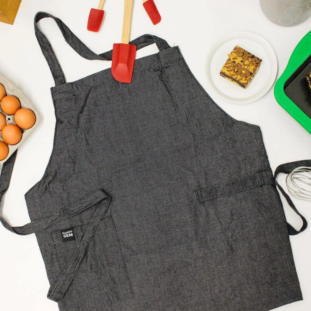 A favorite with both professional and hobby chefs, this stylish apron with black denim look not only helps to protect your clothes from stains, it also adds a touch of that Gem style to your kitchen. The apron is equipped with an adjustable neck strap, a generous front pocket and a practical towel loop. Because it’s made from 100% cotton, you can just pop it in the washing machine for easy cleaning.