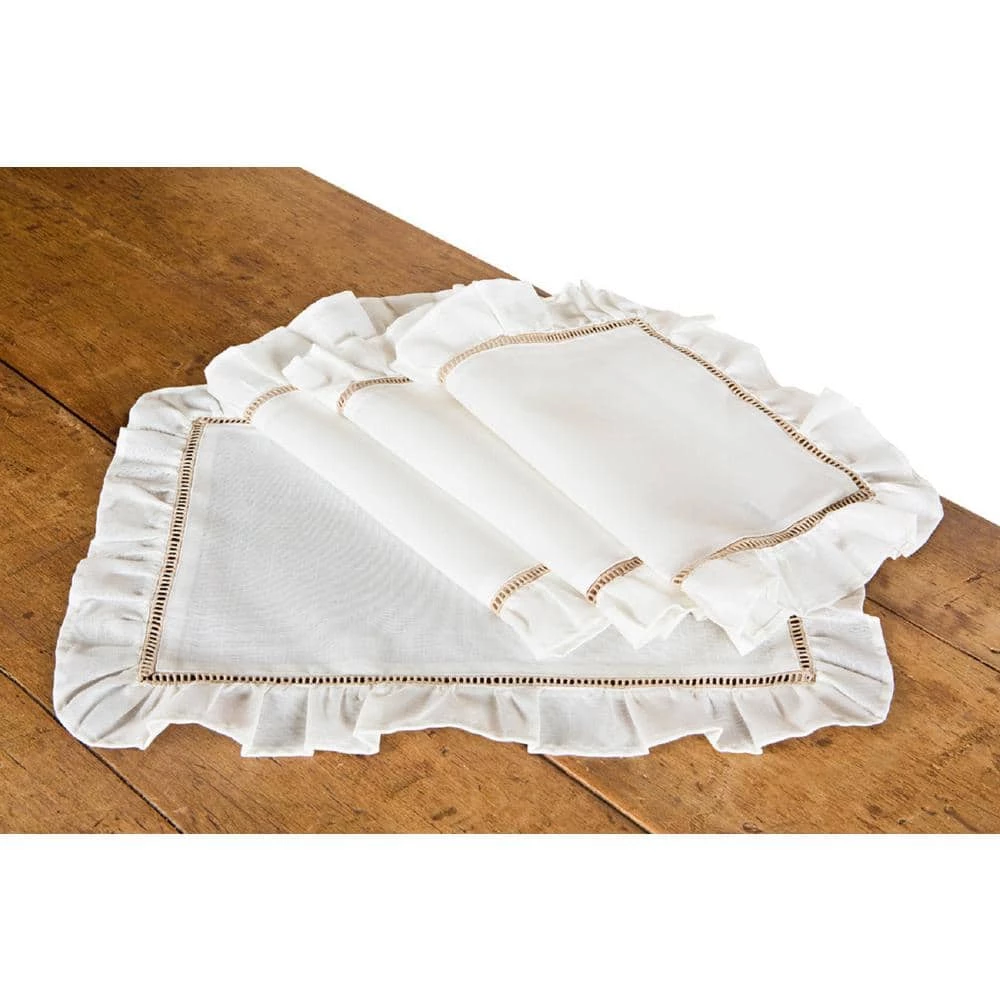 Clean and classic hemstitch linens with a couture twist. This collection features a ruffle trim making for an elegant and eye catching accent when entertaining or anytime you want to add a touch of panache to your table. Linen and Poly viscose. mix, Machine Washable.