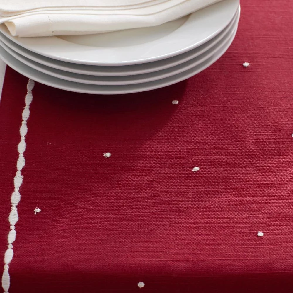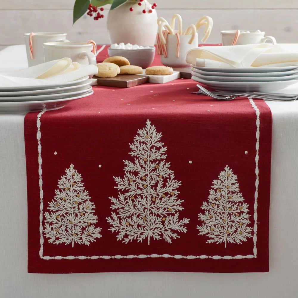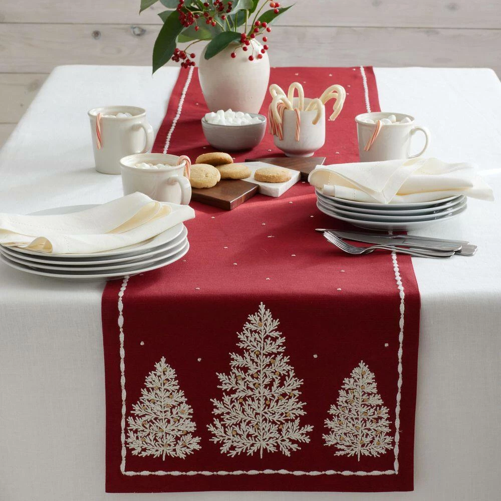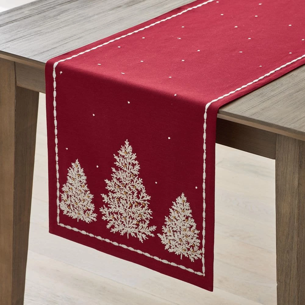 Bring seasonal cheer to all your holiday entertaining from casual gatherings to elegant soirees with our embroidered table runner. Featuring prancing reindeer or wintry trees in your choice of ivory or red, our festive collection is sewn of textural linen and cotton. Elegant finishings like metallic thread and cord give each piece an extra special touch. Exclusively by The Company Store.