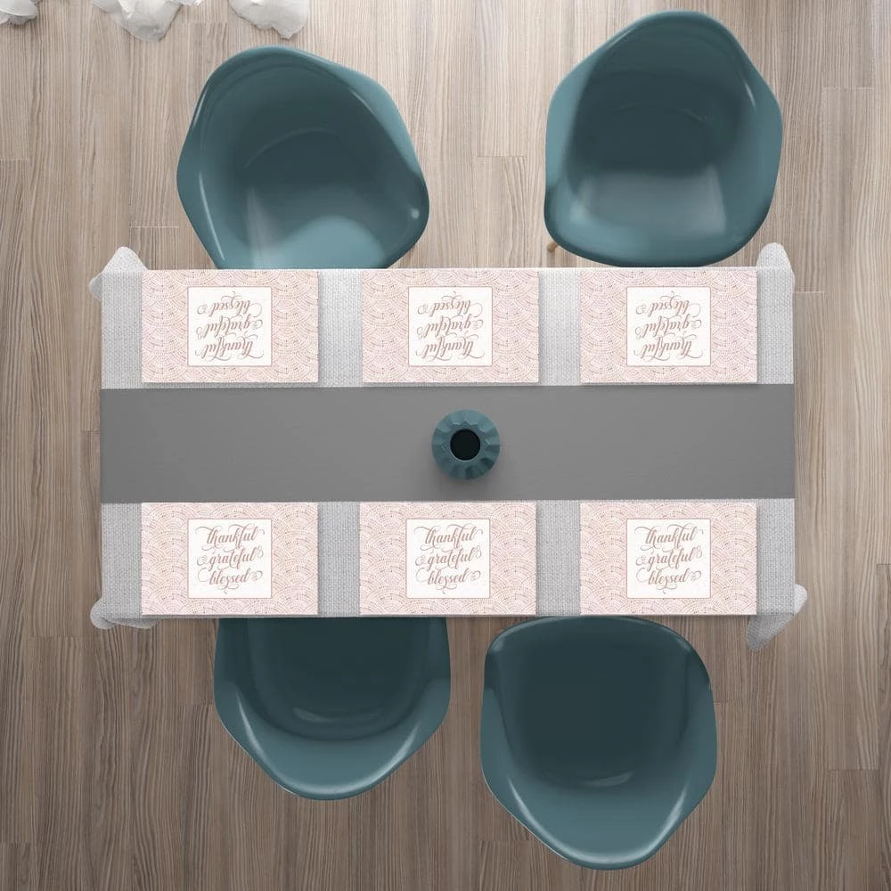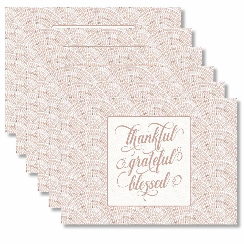Fashion forward and functional, the MHF Home Thankful Grateful Bless Sand Placemat Set will protect any tabletop. The face is constructed from polypropylene, making clean up a breeze, and the back is foam so the placemats will not slide around. Stain, spill, and water resistant, these placemats will add style to any space.
