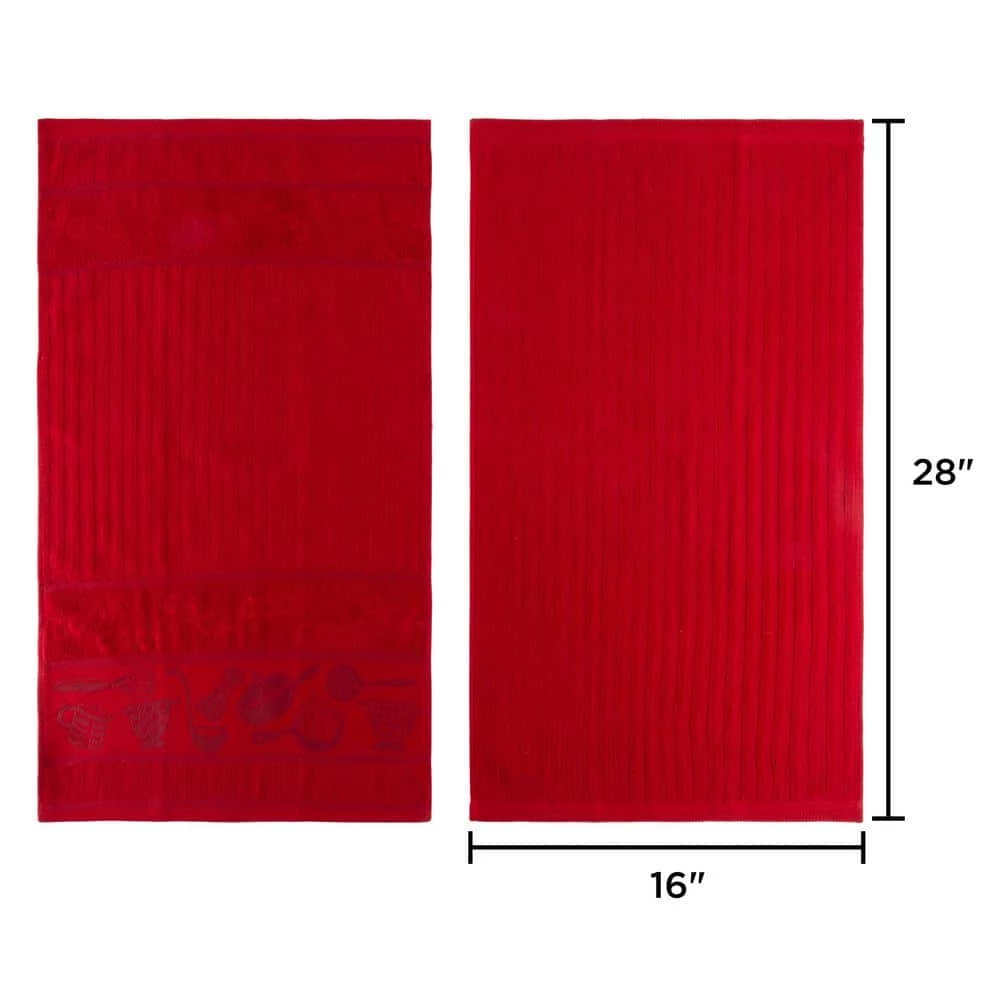Bring fresh style and function into your kitchen and home with this Kitchen Towel Set by Lavish Home. These versatile dish towels are made of super absorbent 100% cotton and feature a chic pattern weave, providing a fun modern look as well as an enhanced texture for cleaning and drying. This pack of 8 hand towels feature modern kitchen icons including a ladle, salt-shaker and pots in four colors (red, teal, yellow and green) and 4 coordinating solid colored towels that you can use together or alone to coordinate with any kitchen and dining decor. They can serve as festive hand towels or easy table napkins, and make the perfect housewarming gift!
