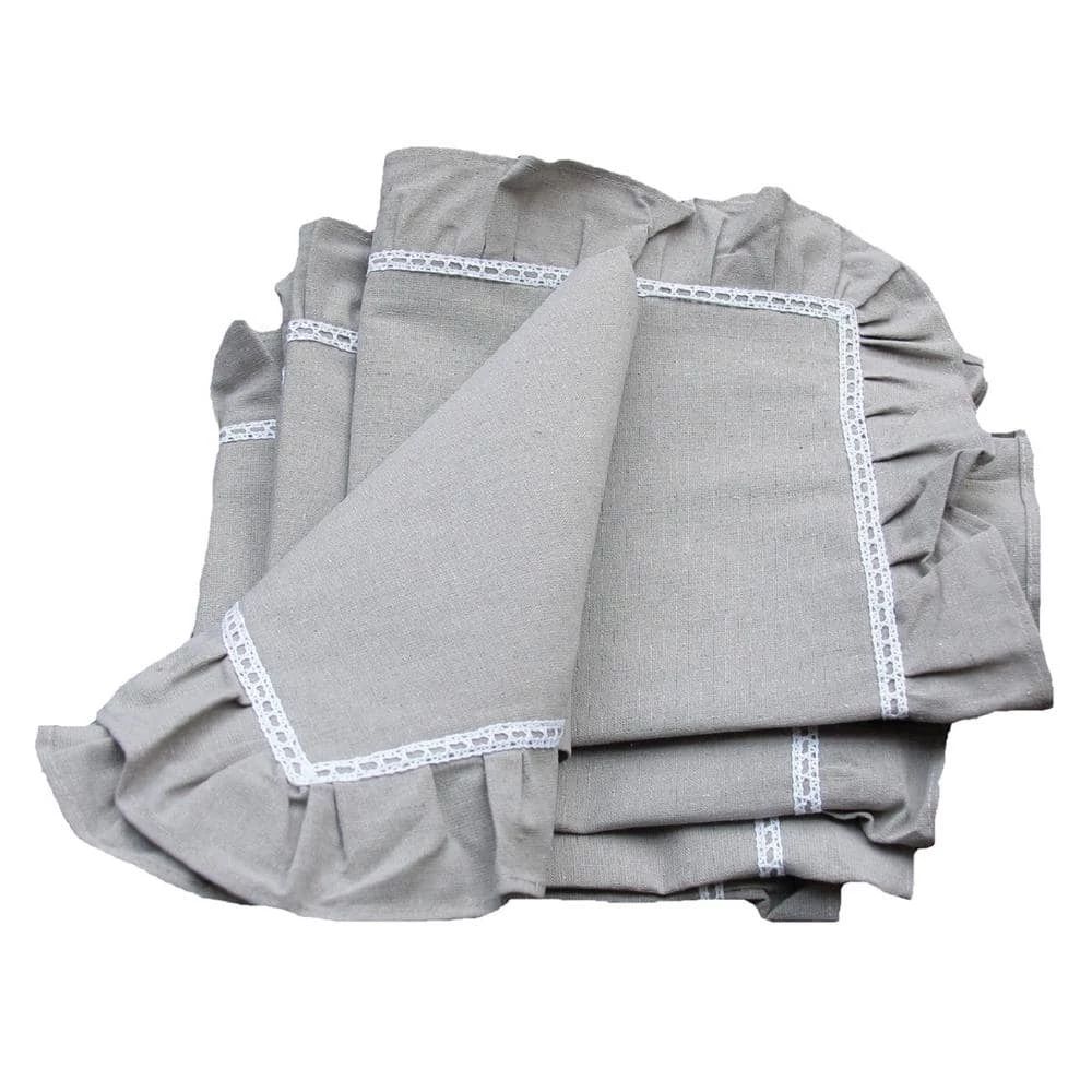 White lace accents this stylish and elegant ruffled table linens collection. Equally attractive for formal occasions and every day. Linen Poly viscose blend. Machine Washable.