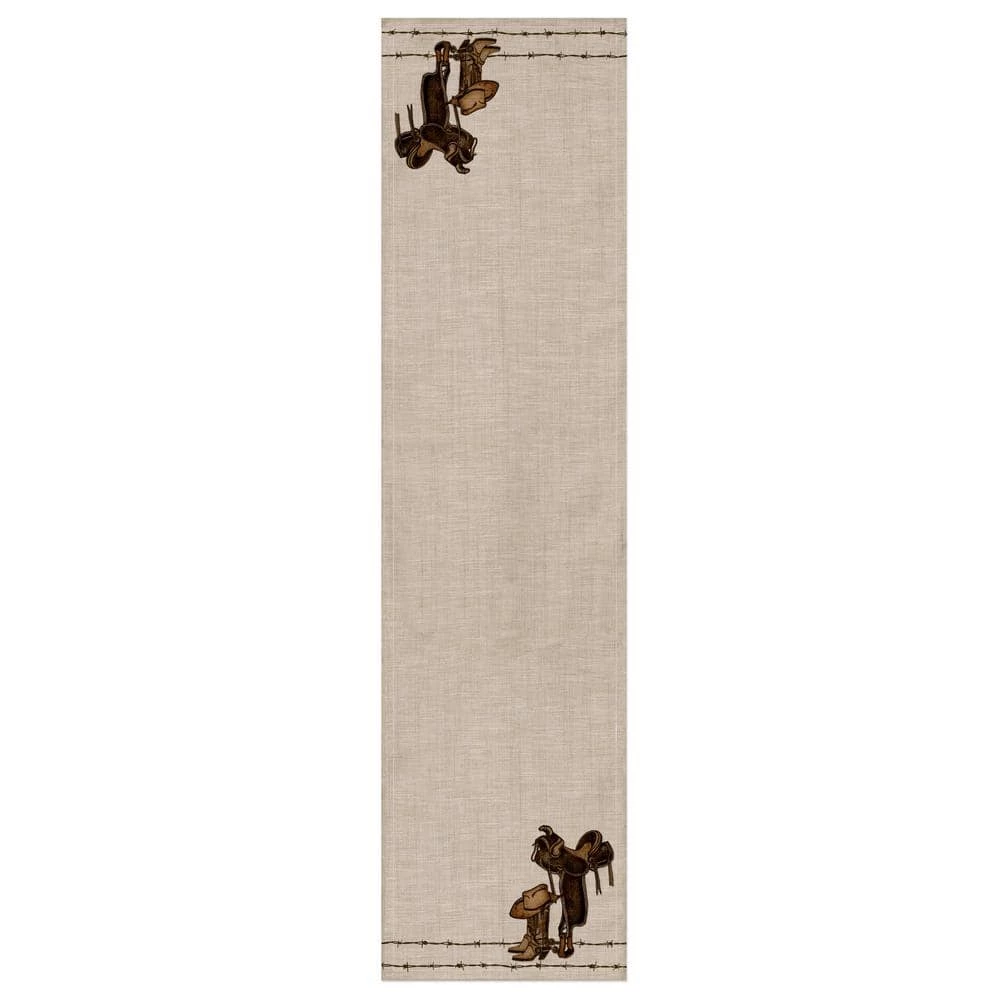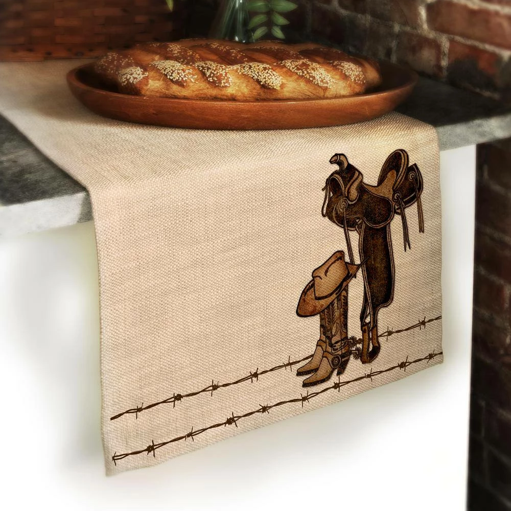 Honor your love for horses by layering the Tack Room runner on any table. Evocative of the frontier, this fancy Western saddle is just waiting for a horse and a rider. It’s ready to head out and tame the Wild West! This richly colored table piece features warm browns and is expertly printed on soft, woven polyester for easy care.